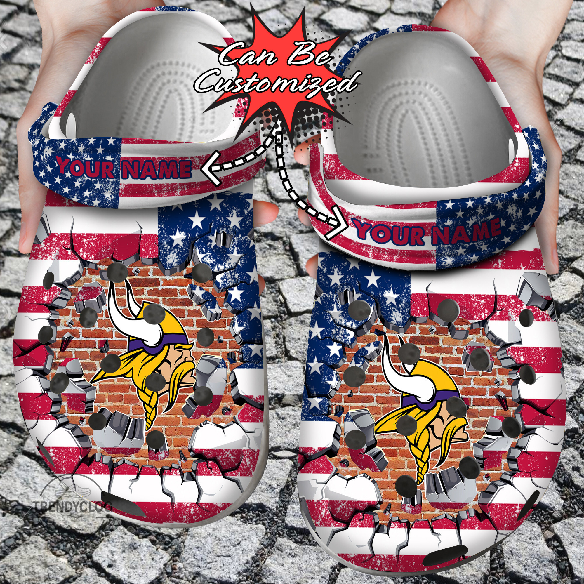 Merchidea Football Personalized MVikings American Flag Breaking Wall Clog Shoes