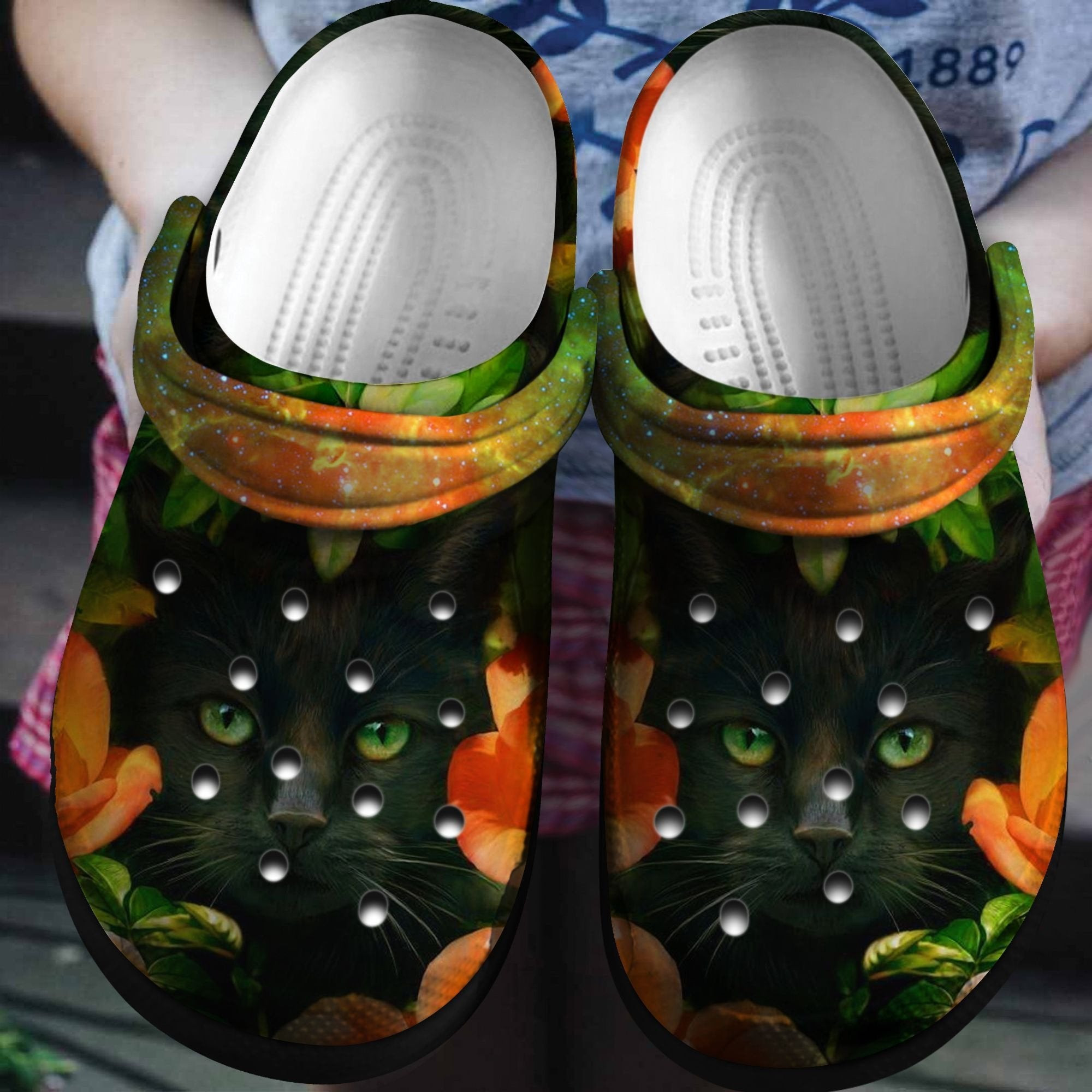 Merchidea Halloween Black Cat In Flowers Shoes – Animal Art Clogs Gift – Cat-Flw