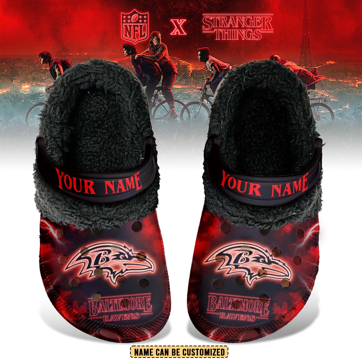 Merchidea Baltimore Ravens x Stranger Things Crocs Crocband Fleece Lined Clogs Shoes Comfortable For Men Women and Kids In Winter