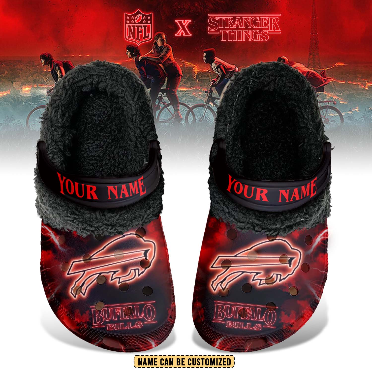 Merchidea Buffalo Bills x Stranger Things Crocs Crocband Fleece Lined Clogs Shoes Comfortable For Men Women and Kids In Winter