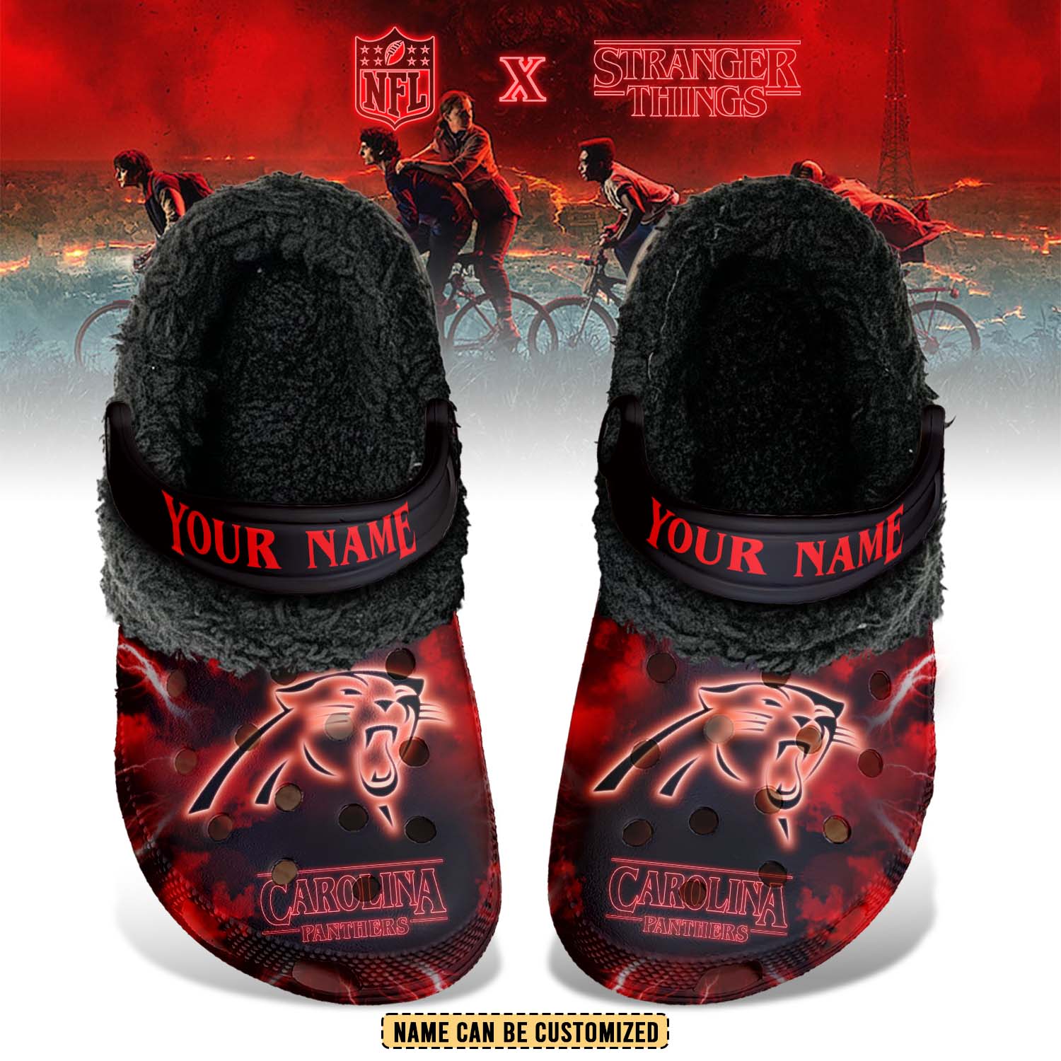 Merchidea Carolina Panthers x Stranger Things Crocs Crocband Fleece Lined Clogs Shoes Comfortable For Men Women and Kids In Winter