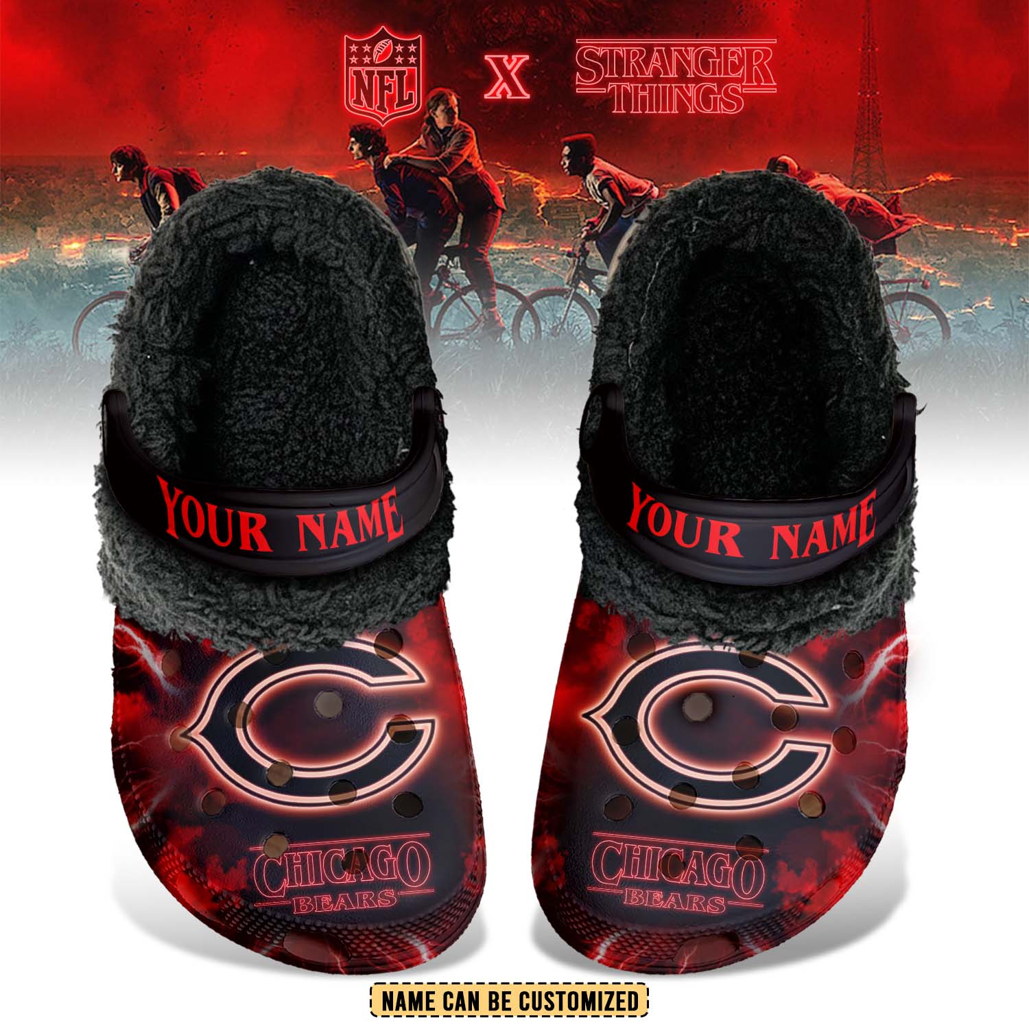 Merchidea Chicago Bears x Stranger Things Crocs Crocband Fleece Lined Clogs Shoes Comfortable For Men Women and Kids In Winter
