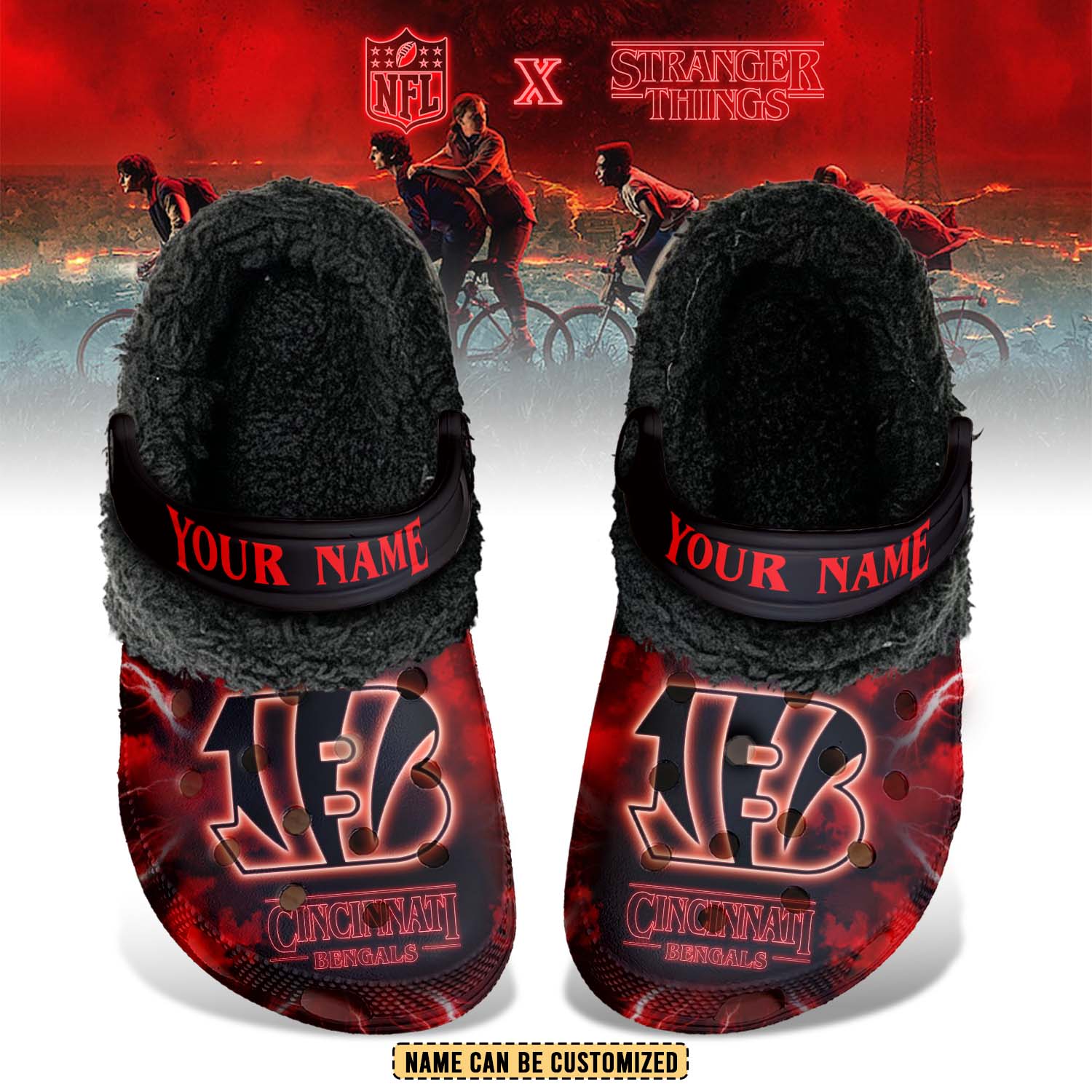 Merchidea Cincinnati Bengals x Stranger Things Crocs Crocband Fleece Lined Clogs Shoes Comfortable For Men Women and Kids In Winter
