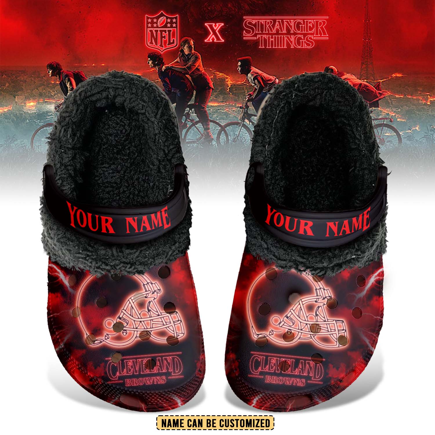 Merchidea Cleveland Browns x Stranger Things Crocs Crocband Fleece Lined Clogs Shoes Comfortable For Men Women and Kids In Winter