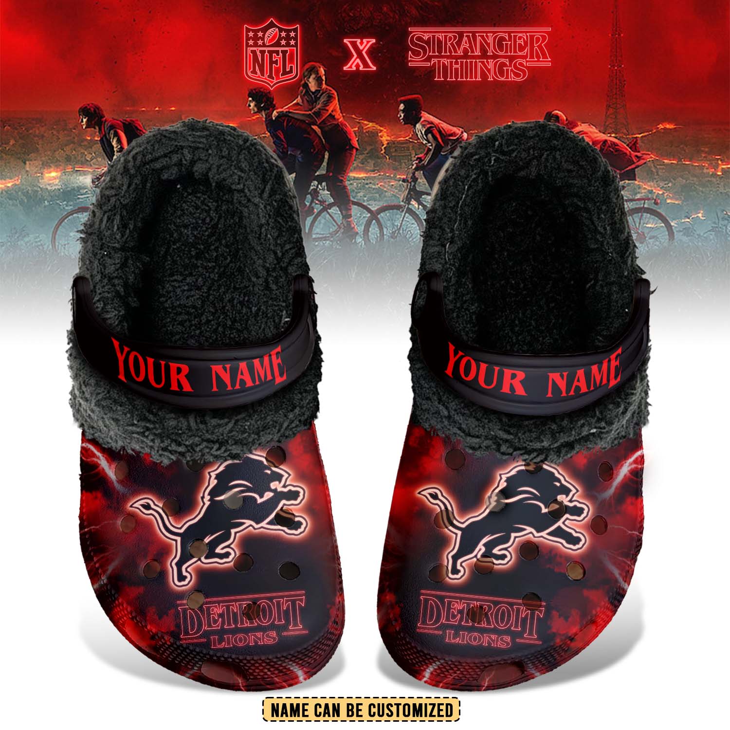 Merchidea Detroit Lions x Stranger Things Crocs Crocband Fleece Lined Clogs Shoes Comfortable For Men Women and Kids In Winter
