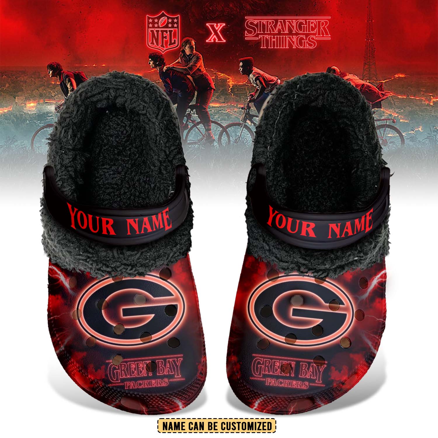 Merchidea Green Bay Packers x Stranger Things Crocs Crocband Fleece Lined Clogs Shoes Comfortable For Men Women and Kids In Winter