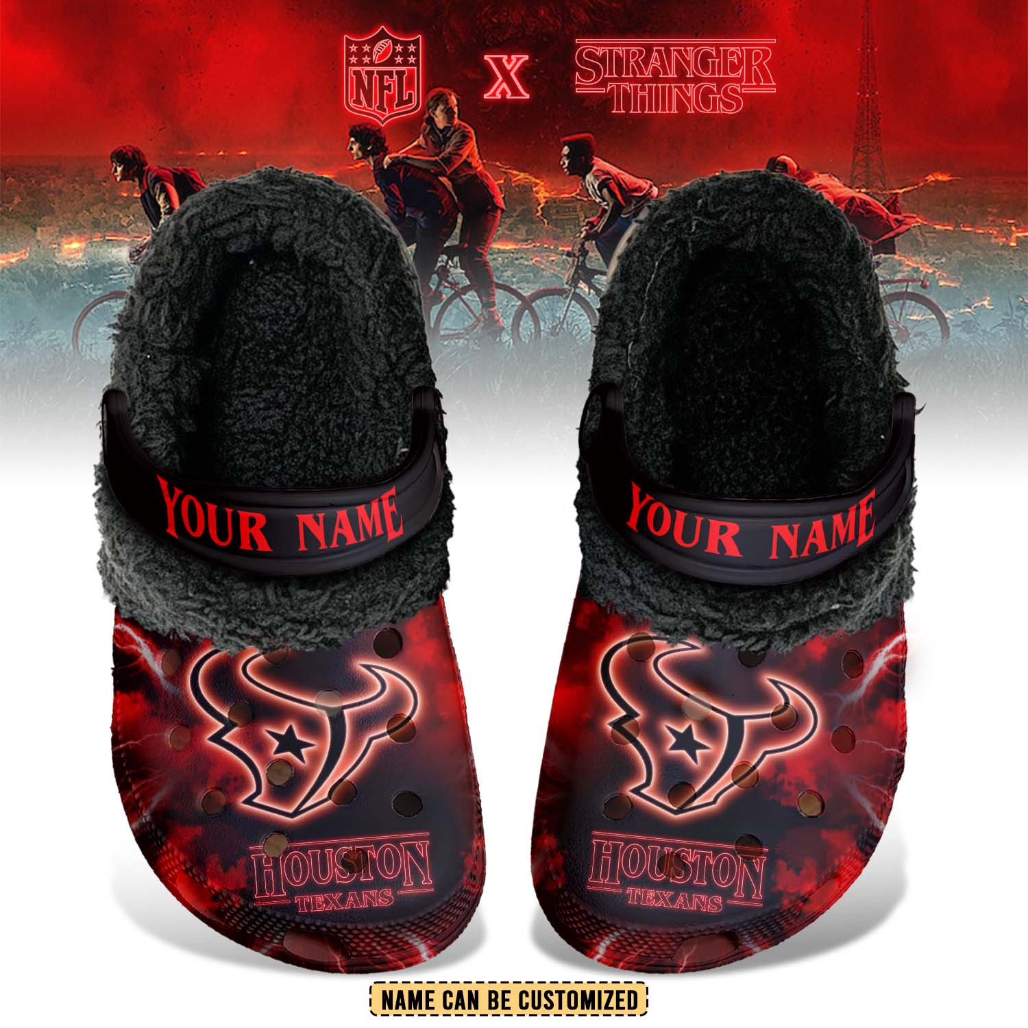 Merchidea Houston Texans x Stranger Things Crocs Crocband Fleece Lined Clogs Shoes Comfortable For Men Women and Kids In Winter