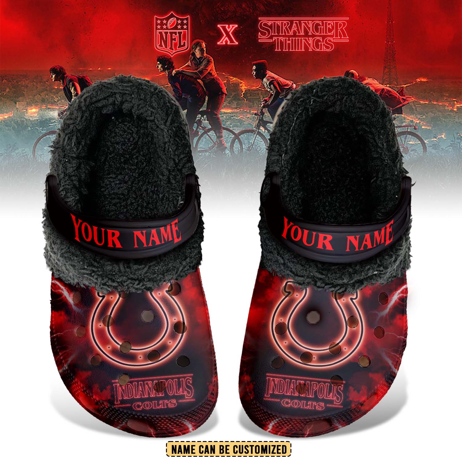 Merchidea Indianapolis Colts x Stranger Things Crocs Crocband Fleece Lined Clogs Shoes Comfortable For Men Women and Kids In Winter