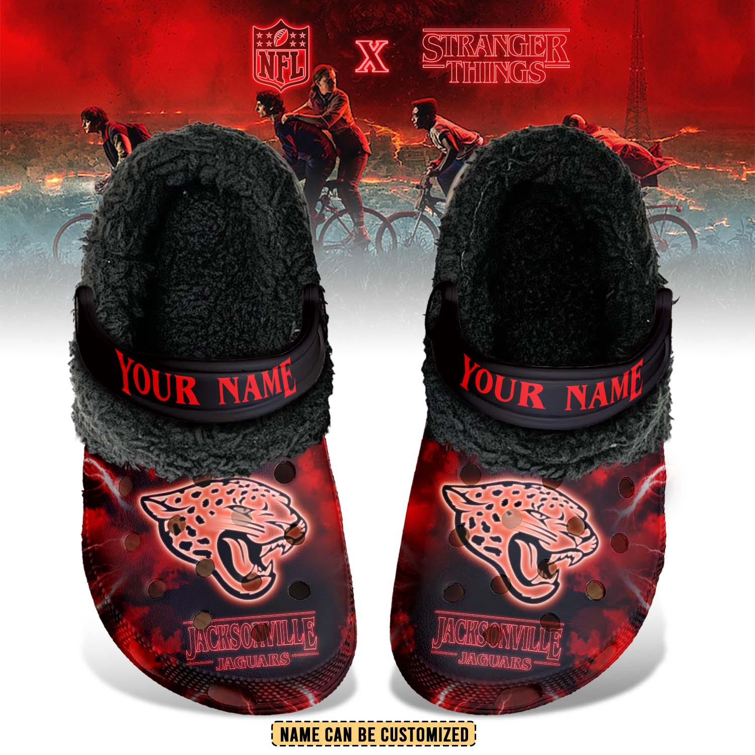 Merchidea Jacksonville Jaguars x Stranger Things Crocs Crocband Fleece Lined Clogs Shoes Comfortable For Men Women and Kids In Winter