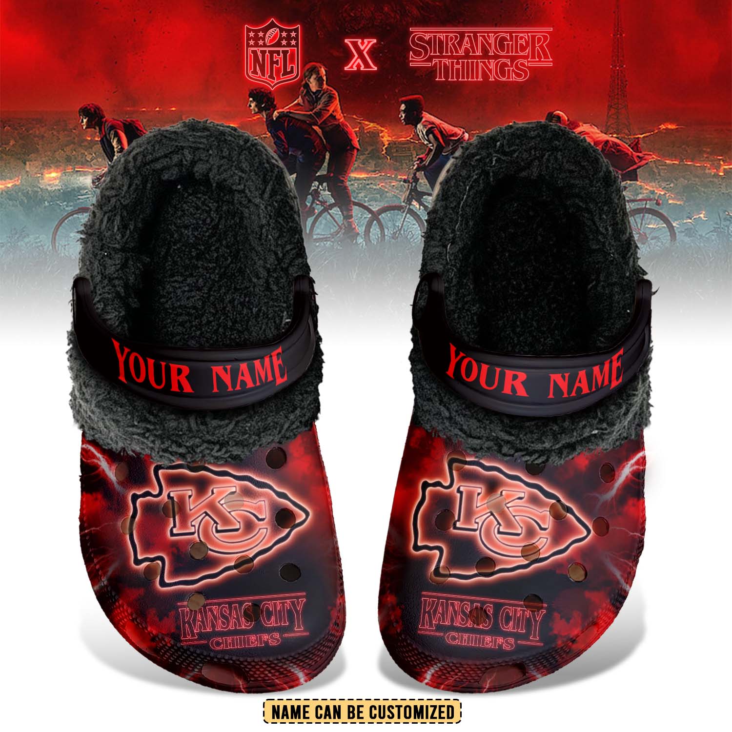 Merchidea Kansas City Chiefs x Stranger Things Crocs Crocband Fleece Lined Clogs Shoes Comfortable For Men Women and Kids In Winter