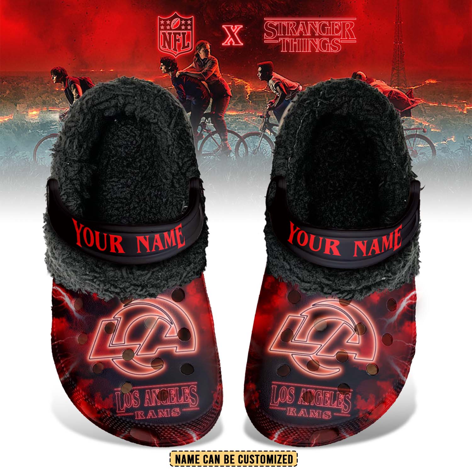 Merchidea Los Angeles Rams x Stranger Things Crocs Crocband Fleece Lined Clogs Shoes Comfortable For Men Women and Kids In Winter