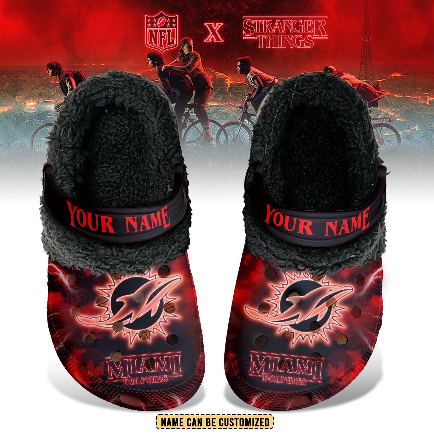 Merchidea Miami Dolphins x Stranger Things Crocs Crocband Fleece Lined Clogs Shoes Comfortable For Men Women and Kids In Winter