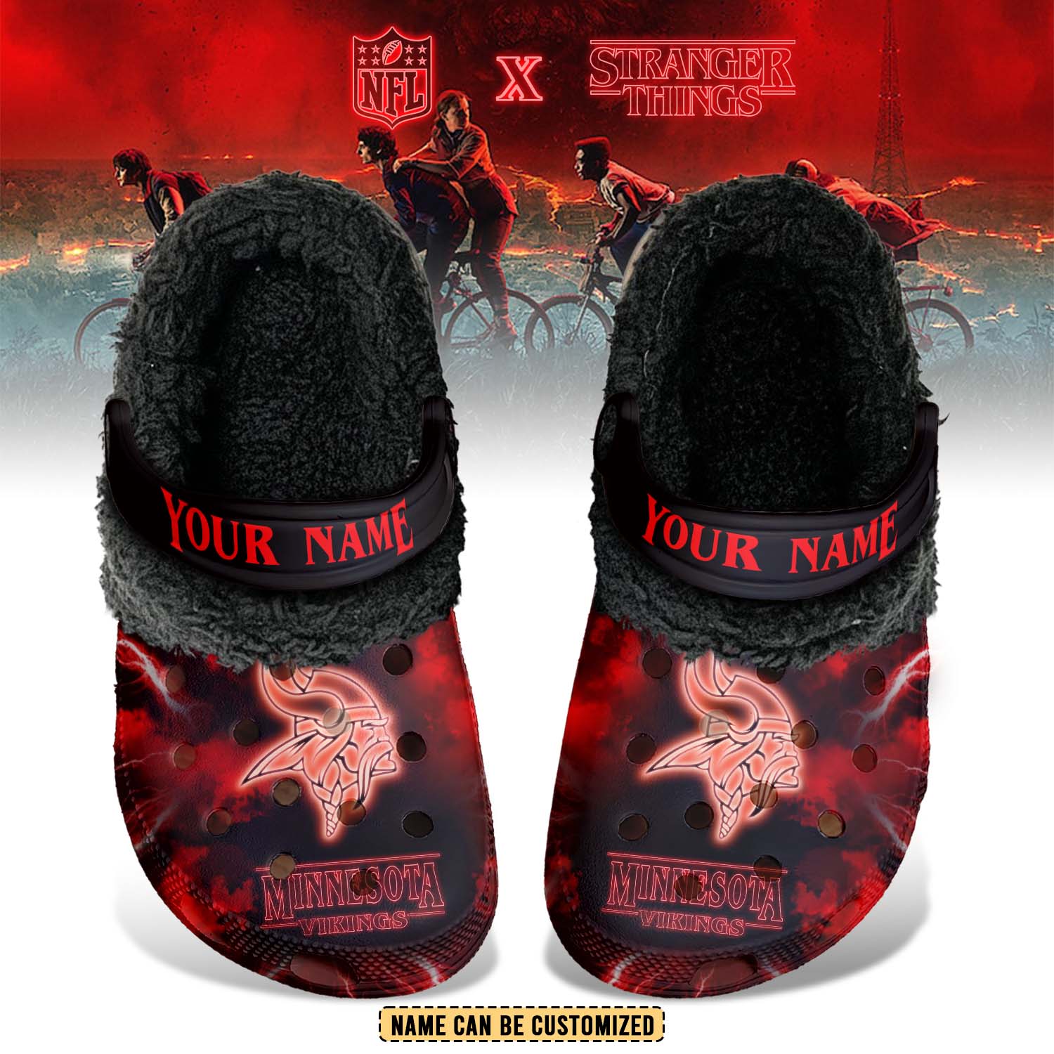 Merchidea Minnesota Vikings x Stranger Things Crocs Crocband Fleece Lined Clogs Shoes Comfortable For Men Women and Kids In Winter