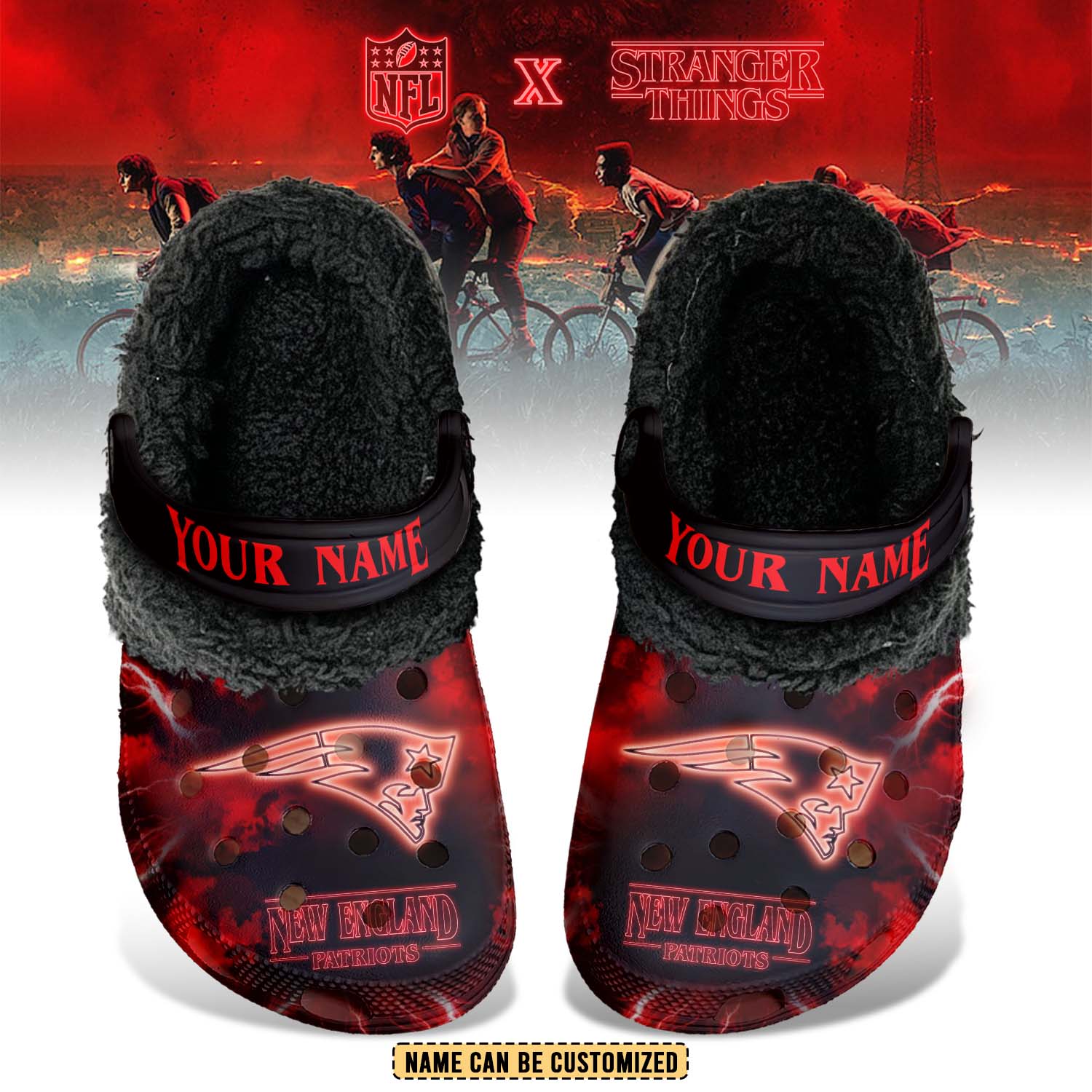 Merchidea New England Patriots x Stranger Things Crocs Crocband Fleece Lined Clogs Shoes Comfortable For Men Women and Kids In Winter