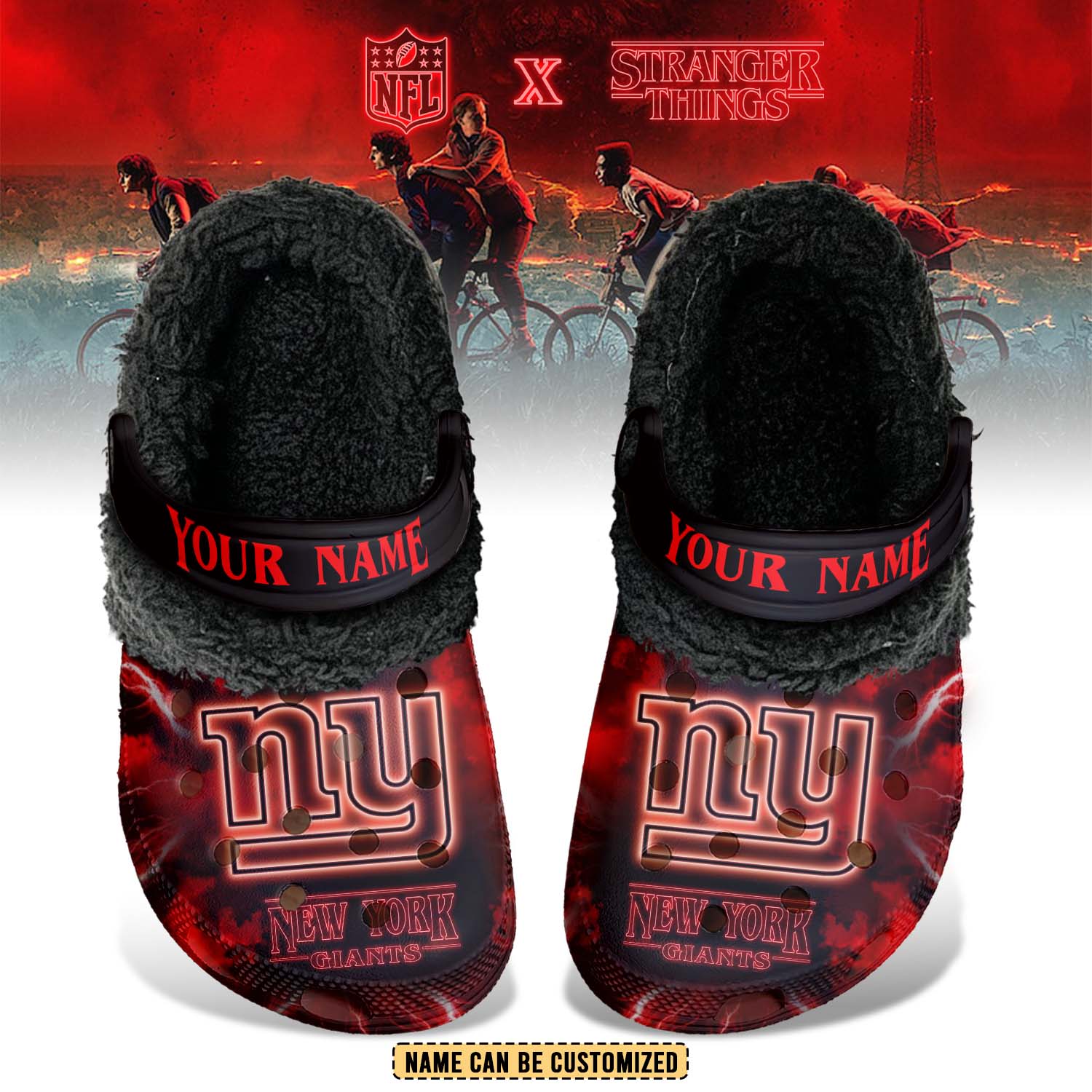 Merchidea New York Giants x Stranger Things Crocs Crocband Fleece Lined Clogs Shoes Comfortable For Men Women and Kids In Winter
