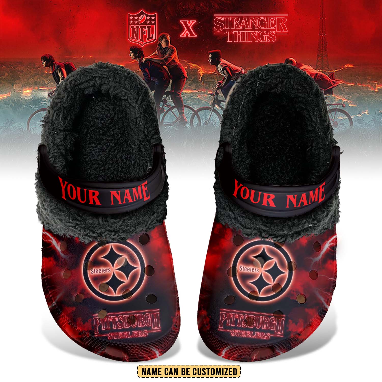 Merchidea Pittsburgh Steelers x Stranger Things Crocs Crocband Fleece Lined Clogs Shoes Comfortable For Men Women and Kids In Winter