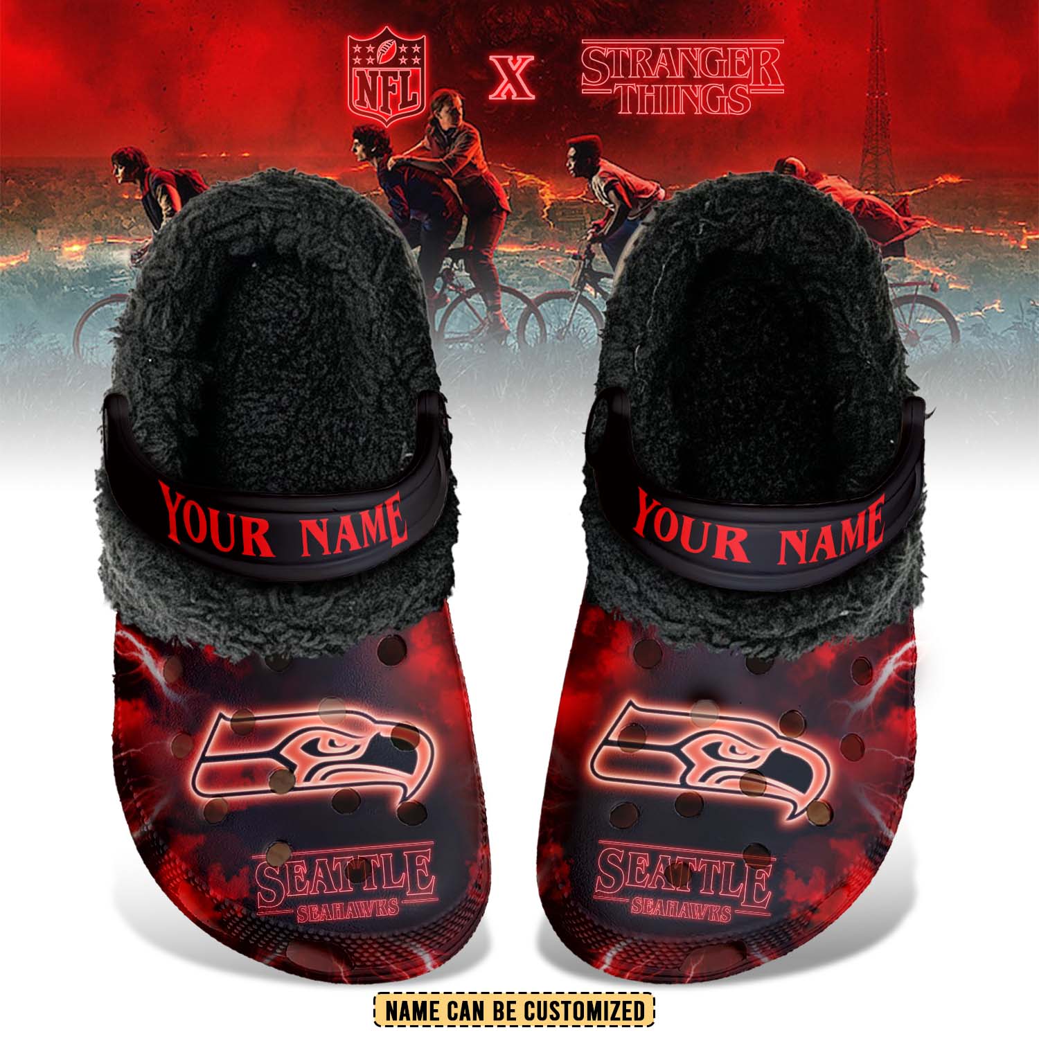 Merchidea Seattle Seahawks x Stranger Things Crocs Crocband Fleece Lined Clogs Shoes Comfortable For Men Women and Kids In Winter