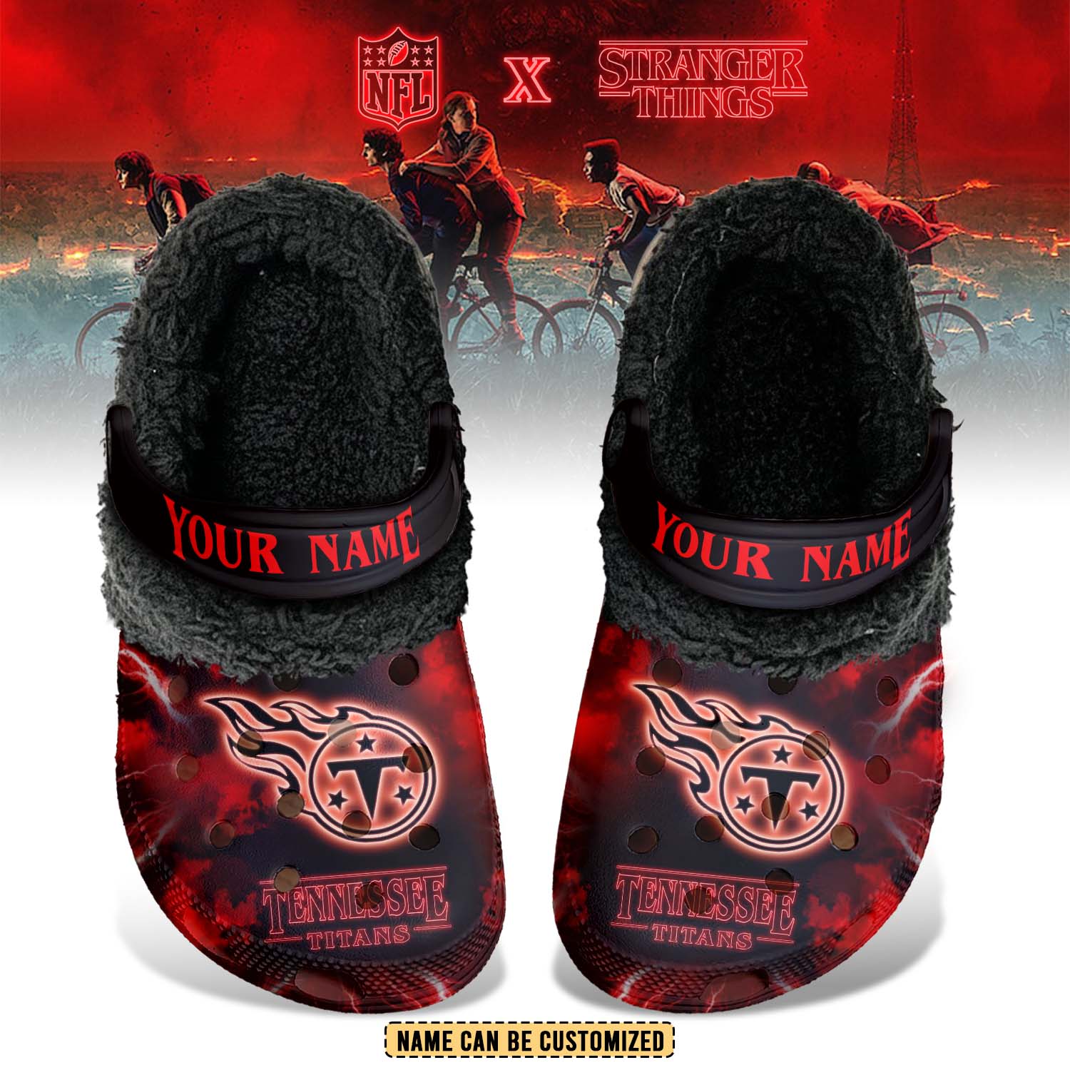 Merchidea Tennessee Titans x Stranger Things Crocs Crocband Fleece Lined Clogs Shoes Comfortable For Men Women and Kids In Winter