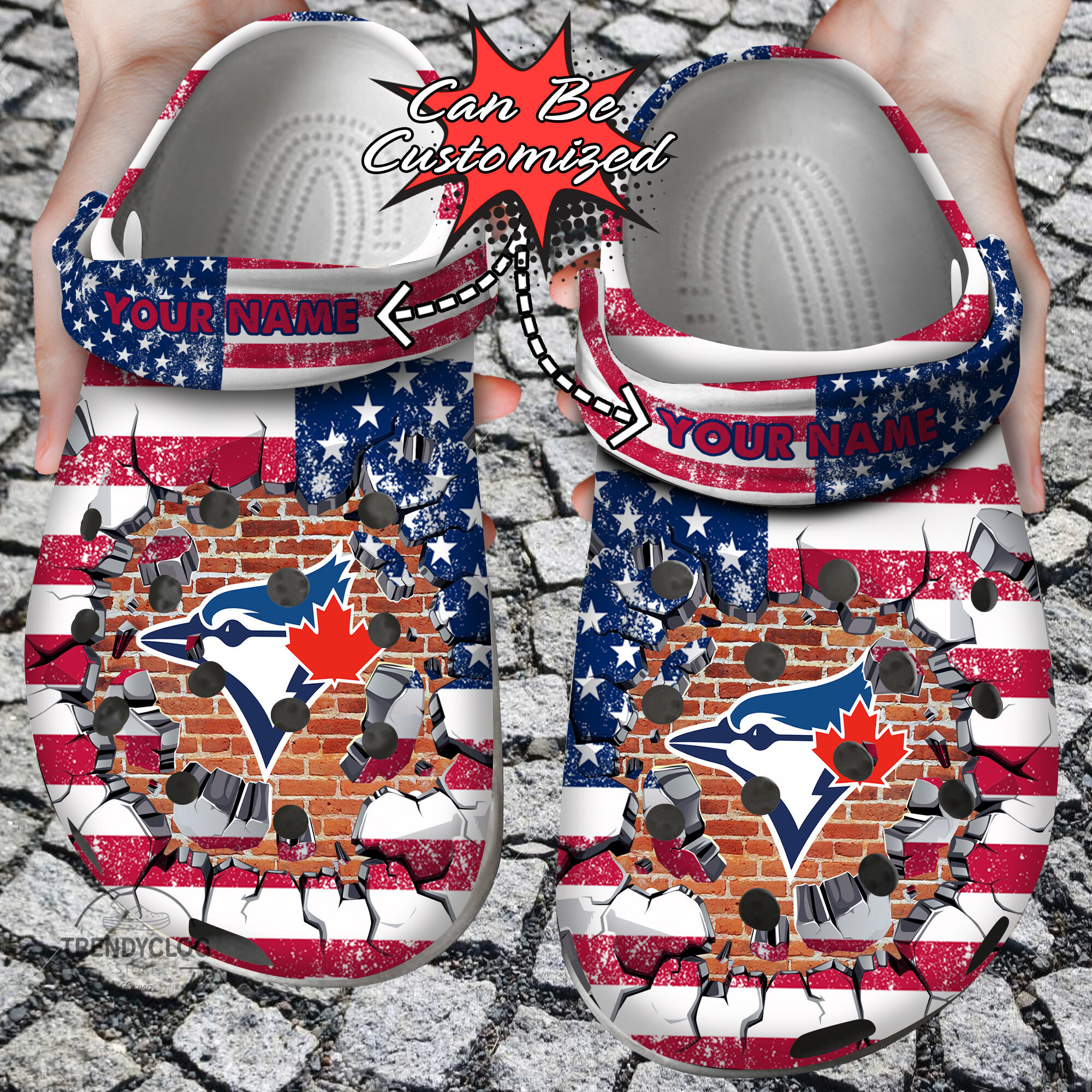 Merchidea Baseball Personalized TBlue Jays American Flag Breaking Wall Clog Shoes