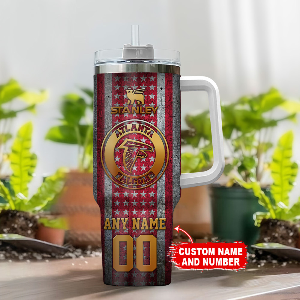 Atlanta Falcons NFL Golden Logos US Flag Custom Stanley Quencher 40oz Stainless Steel Tumbler With Handle