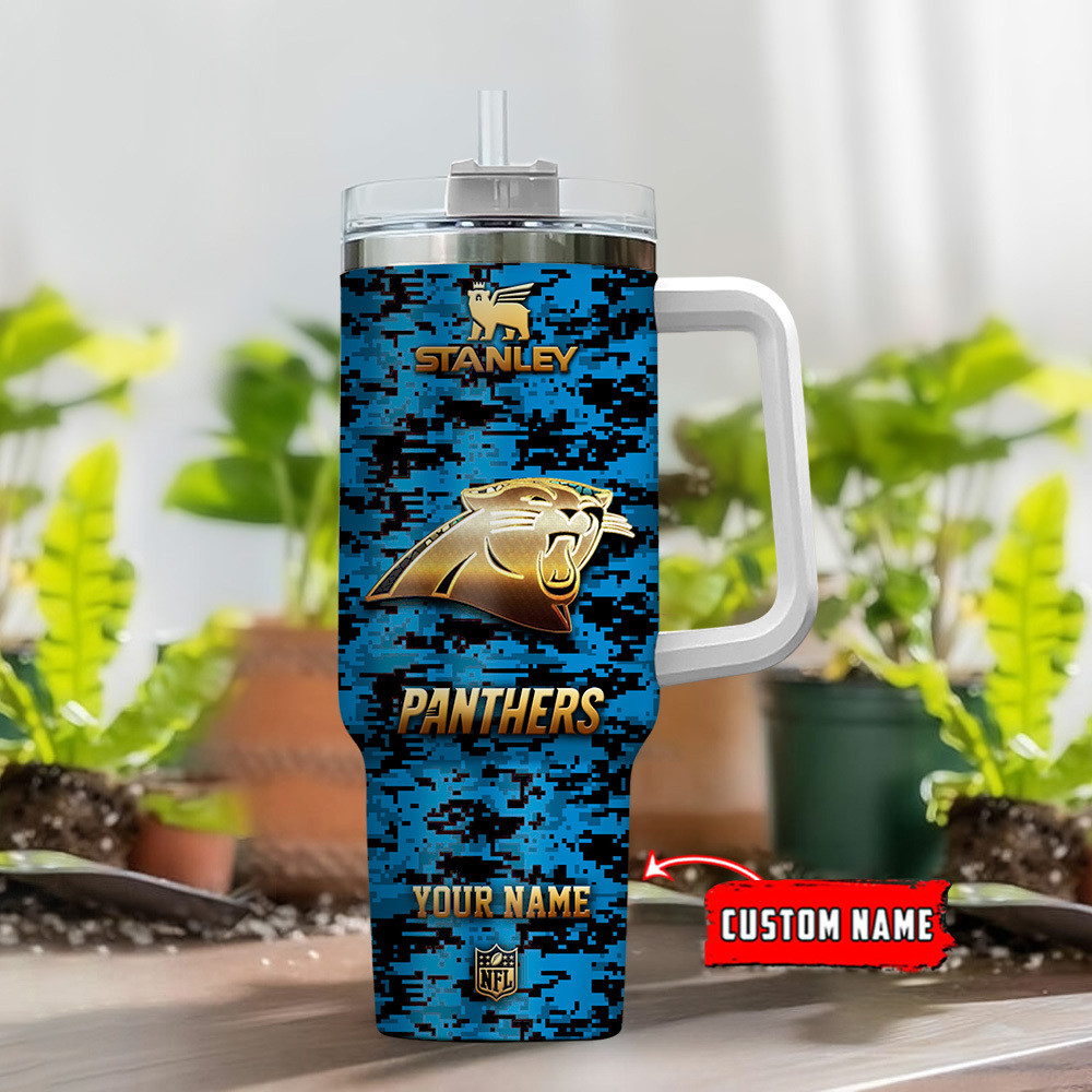 Carolina Panthers NFL Camouflage Golden Logo Custom Stanley Quencher 40oz Stainless Steel Tumbler With Handle