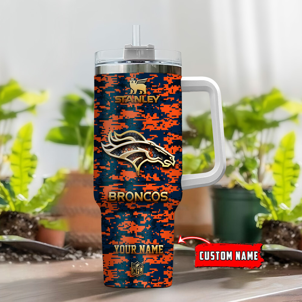 Denver Broncos NFL Camouflage Golden Logo Custom Stanley Quencher 40oz Stainless Steel Tumbler With Handle