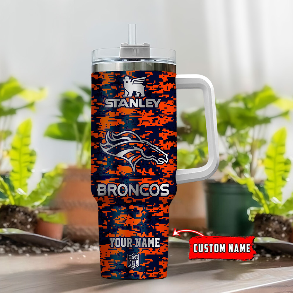 Denver Broncos NFL Camouflage Silver Logo Custom Stanley Quencher 40oz Stainless Steel Tumbler With Handle