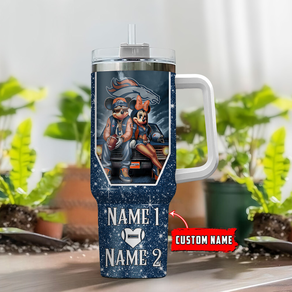 Denver Broncos NFL Mickey And Minnie Couple Custom Stanley Quencher 40oz Stainless Steel Tumbler With Handle