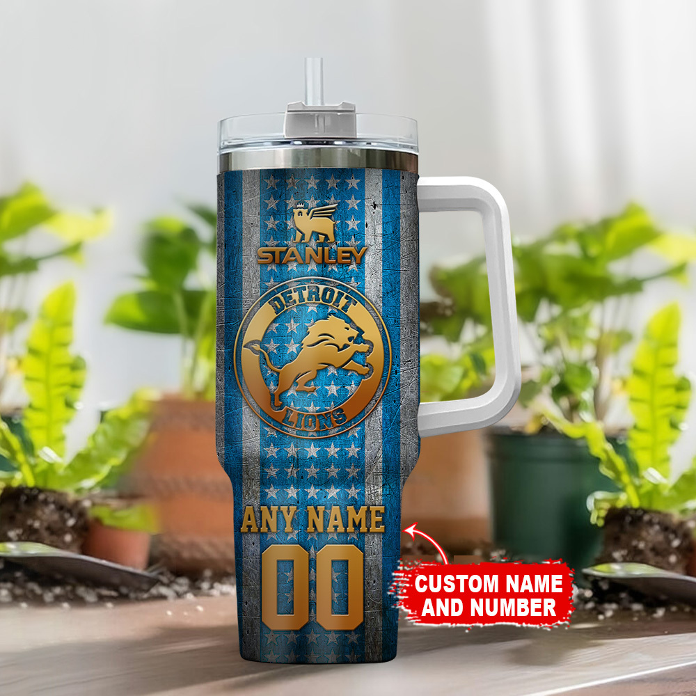 Detroit Lions NFL Golden Logos US Flag Custom Stanley Quencher 40oz Stainless Steel Tumbler With Handle