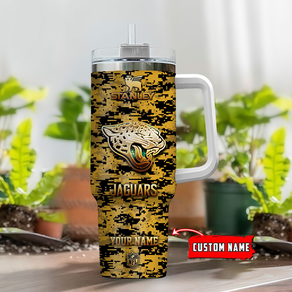 Jacksonville Jaguars NFL Camouflage Golden Logo Custom Stanley Quencher 40oz Stainless Steel Tumbler With Handle