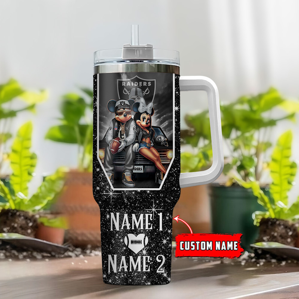 Las Vegas Raiders NFL Mickey And Minnie Couple Custom Stanley Quencher 40oz Stainless Steel Tumbler With Handle