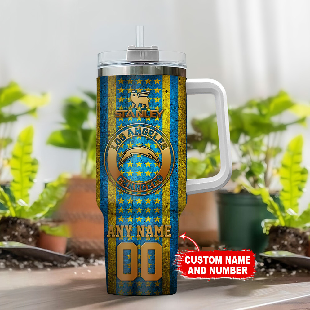 Los Angeles Chargers NFL Golden Logos US Flag Custom Stanley Quencher 40oz Stainless Steel Tumbler With Handle