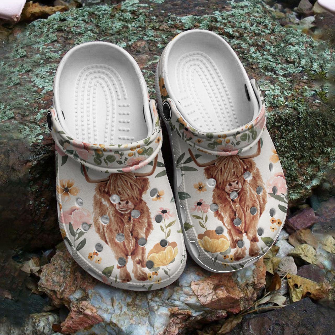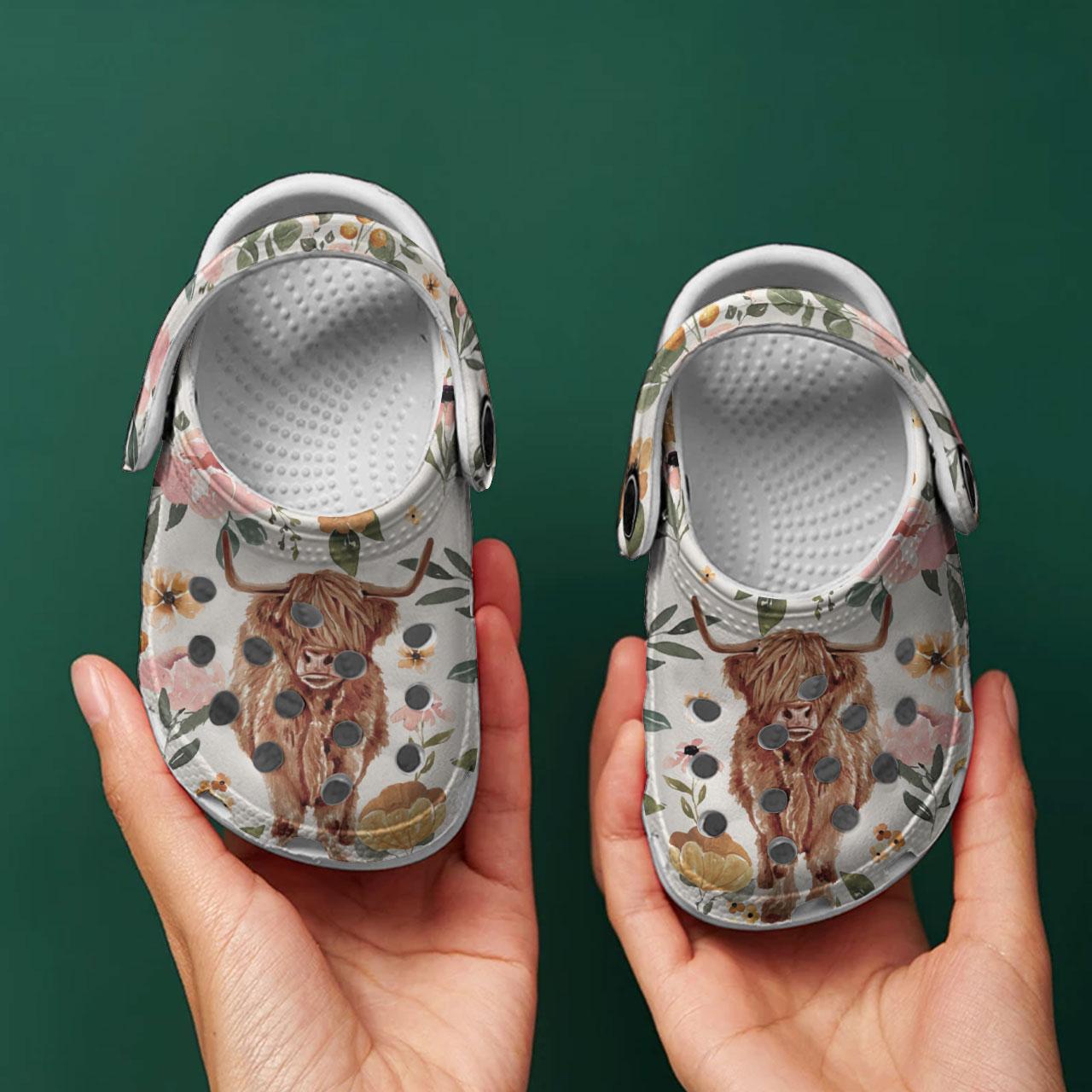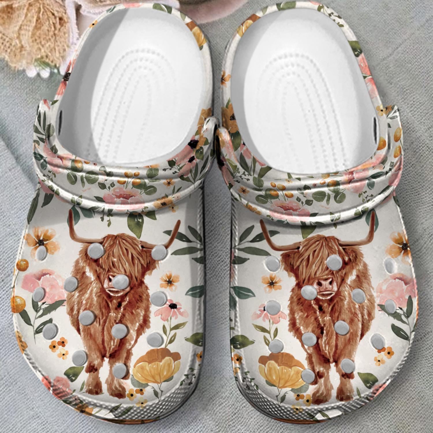 Merchidea Highland Cow Floral Crocs Crocband Clogs Shoes Comfortable For Men Women and Kids