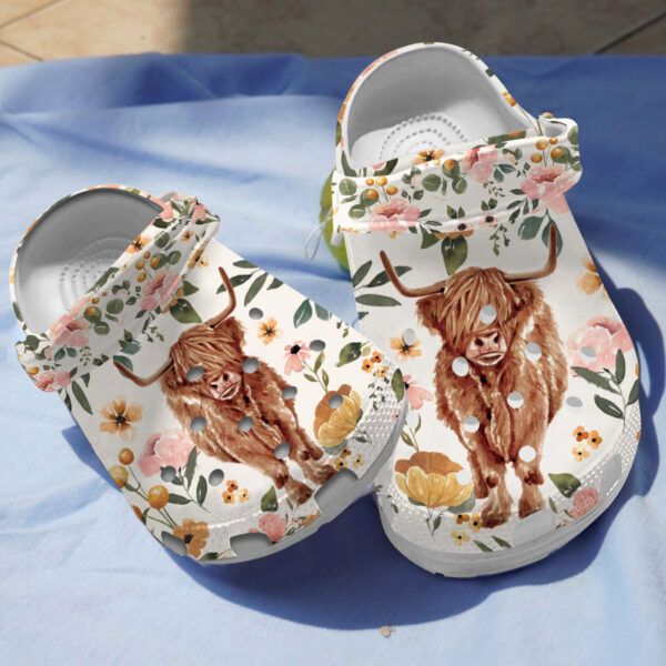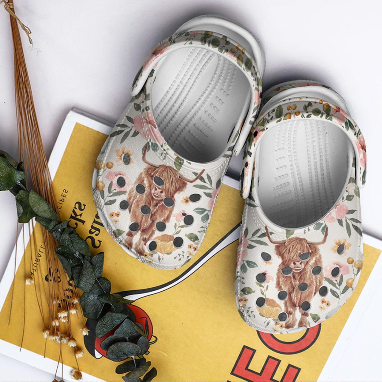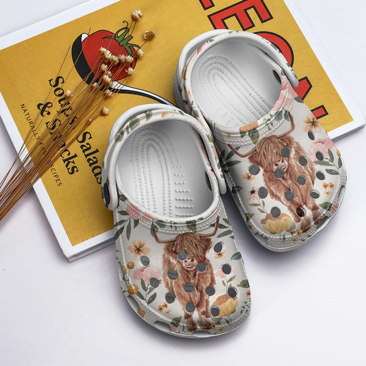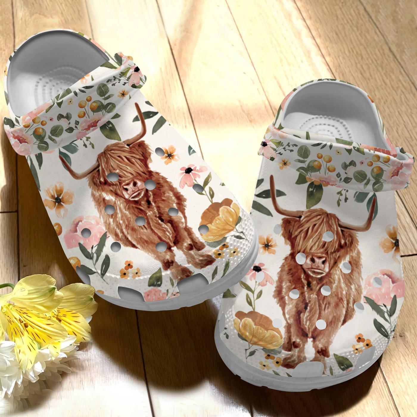 Merchidea Highland Cow Floral Crocs Crocband Clogs Shoes Comfortable For Men Women and Kids