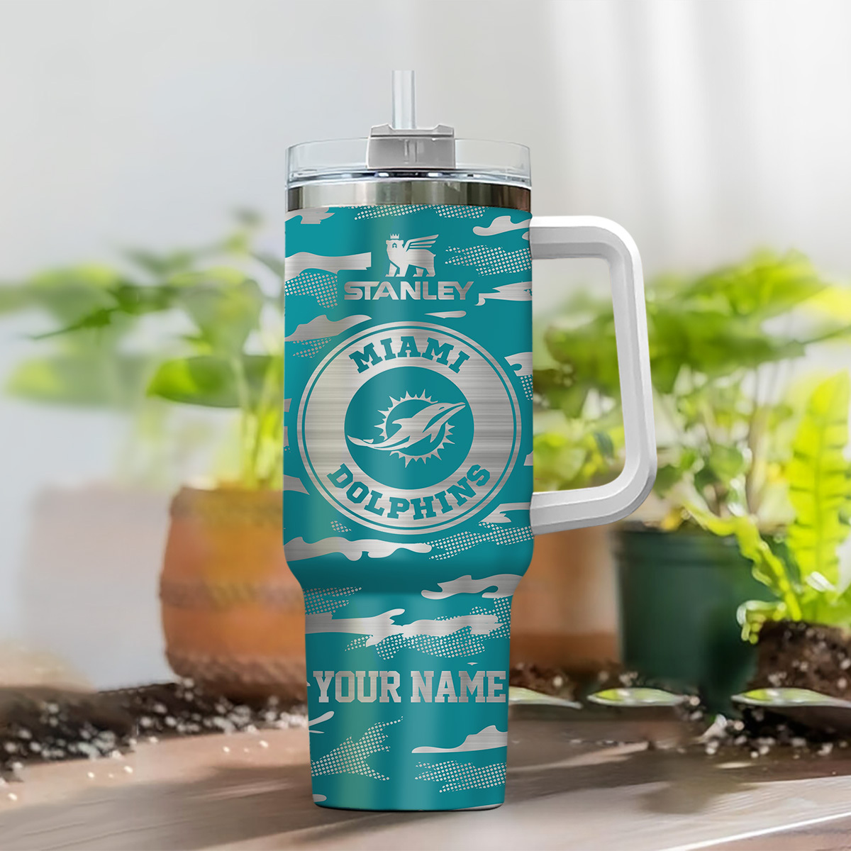 Miami Dolphins NFL Camo Pattern Custom Stanley Quencher 40oz Stainless Steel Tumbler With Handle