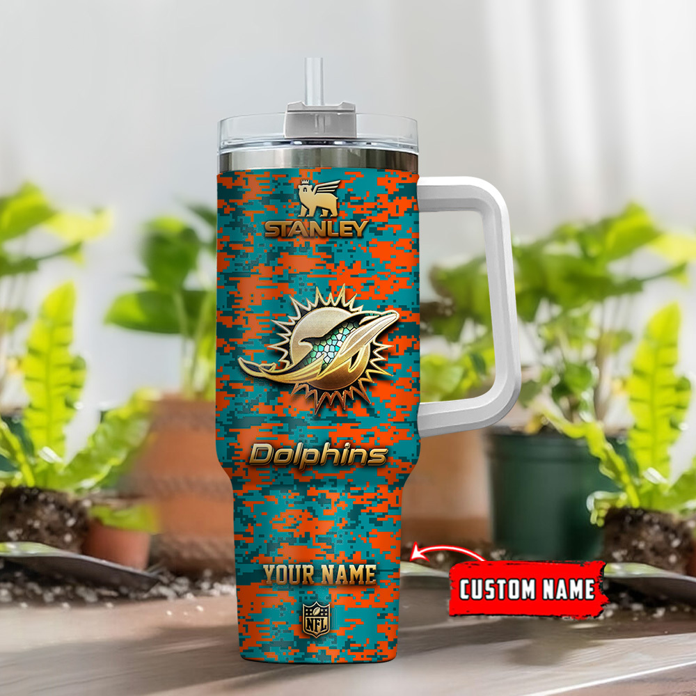 Miami Dolphins NFL Camouflage Golden Logo Custom Stanley Quencher 40oz Stainless Steel Tumbler With Handle