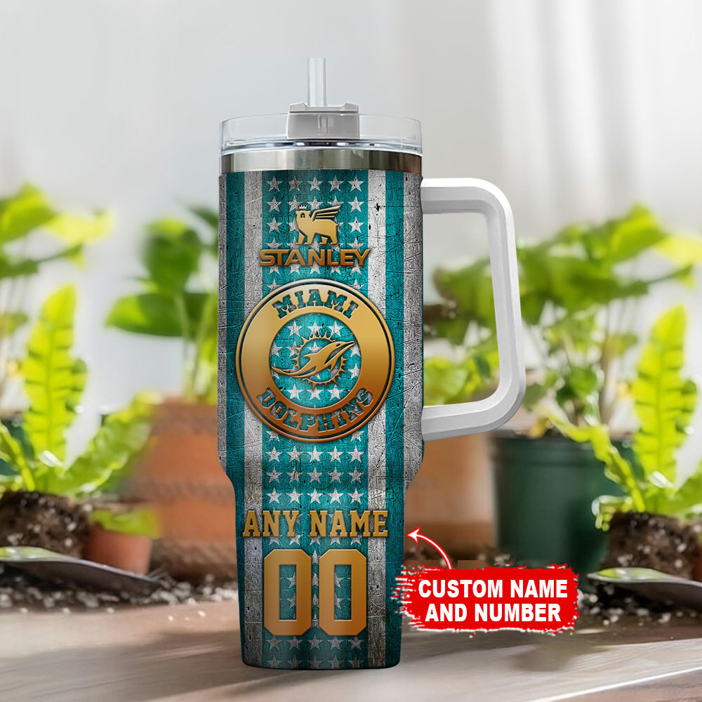 Miami Dolphins NFL Golden Logos US Flag Custom Stanley Quencher 40oz Stainless Steel Tumbler With Handle