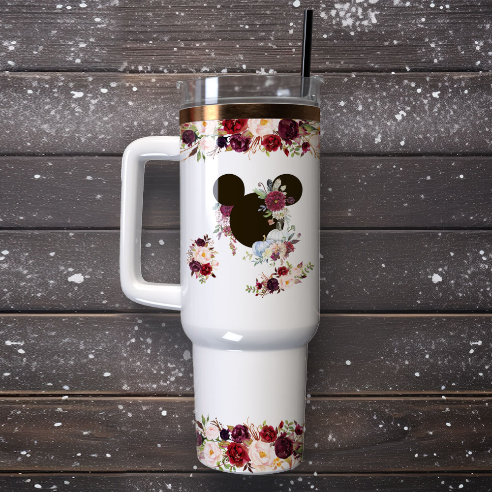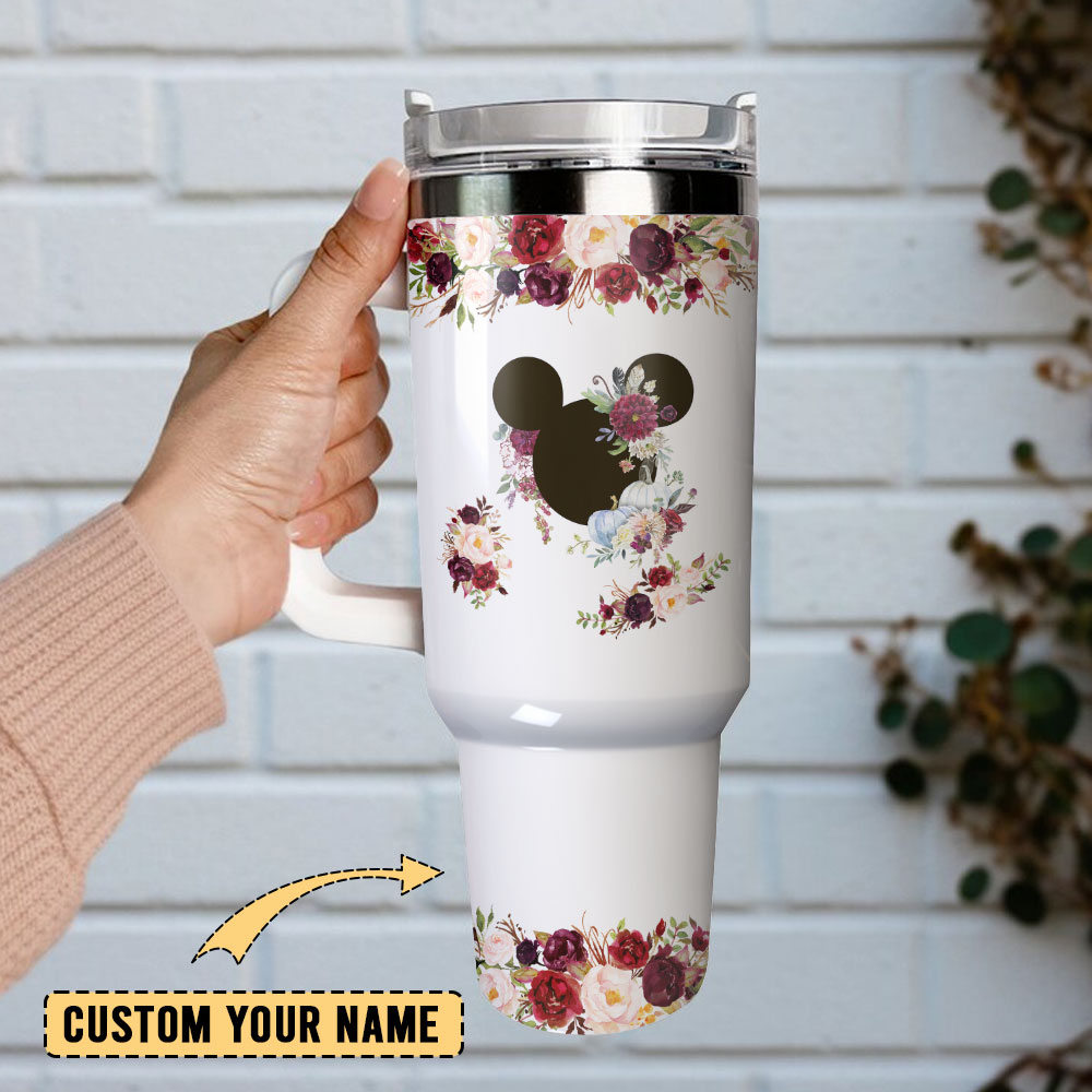 Mickey And Flower Art Custom Stanley Quencher 40oz Stainless Steel Tumbler With Handle