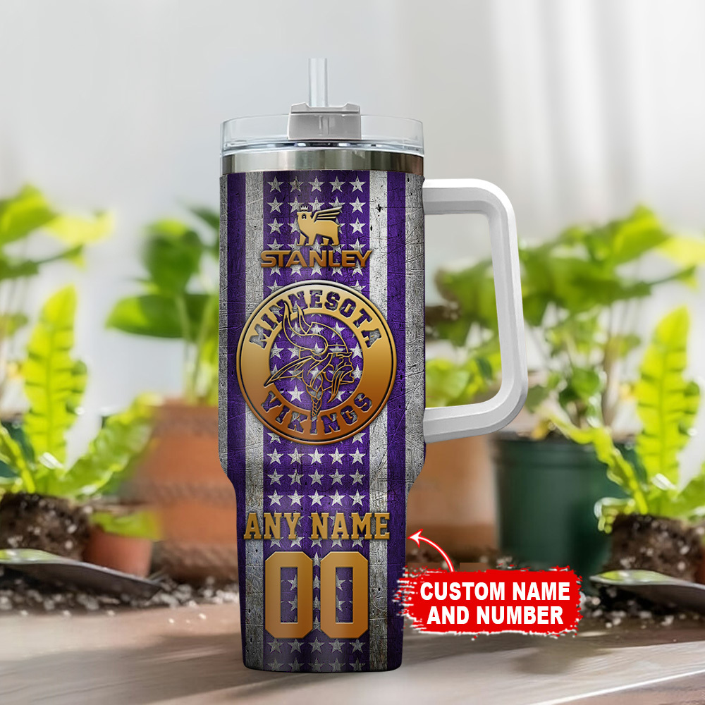 Minnesota Vikings NFL Golden Logos US Flag Custom Stanley Quencher 40oz Stainless Steel Tumbler With Handle