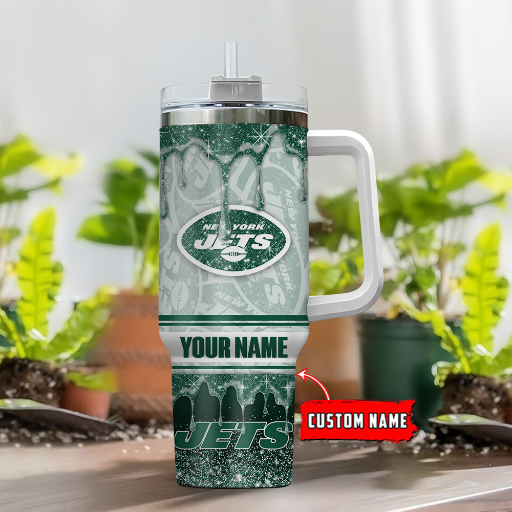 New York Jets NFL Glitter Custom Stanley Quencher 40oz Stainless Steel Tumbler With Handle