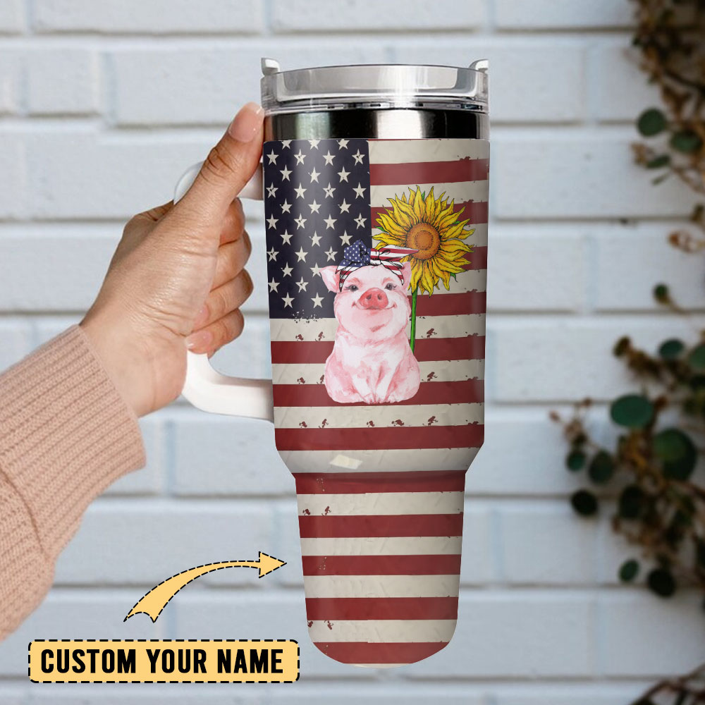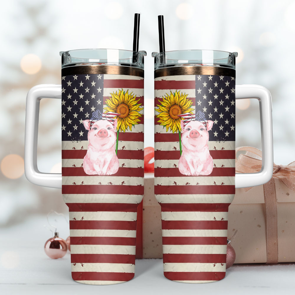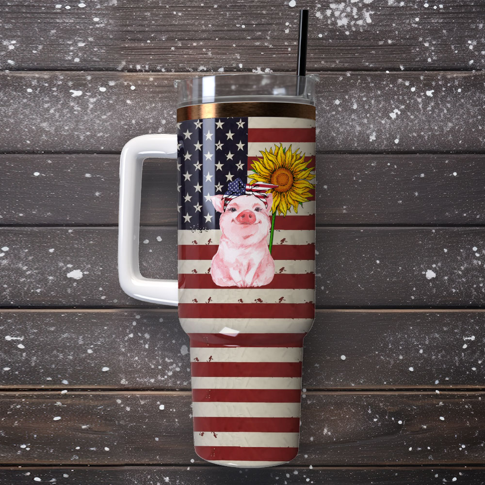 Patriotic Pig Sunflower American Flag Custom Stanley Quencher 40oz Stainless Steel Tumbler With Handle