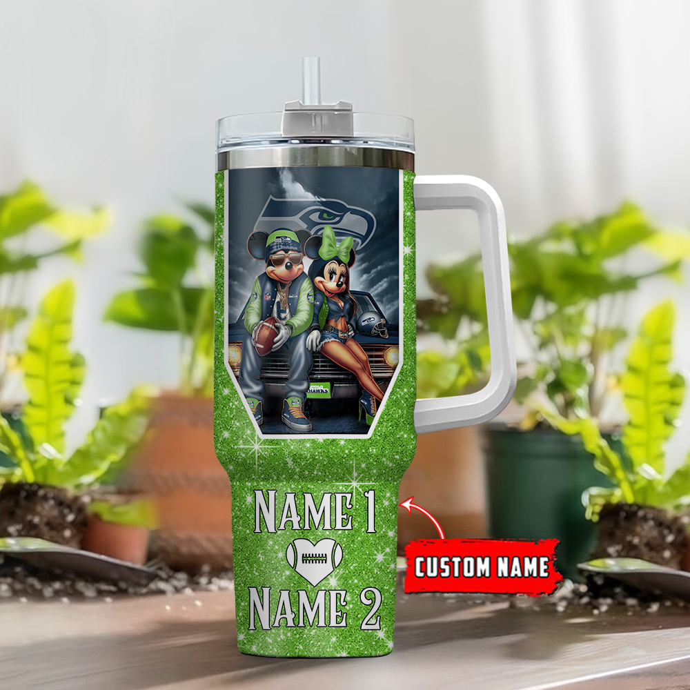 Seattle Seahawks NFL Mickey And Minnie Couple Custom Stanley Quencher 40oz Stainless Steel Tumbler With Handle