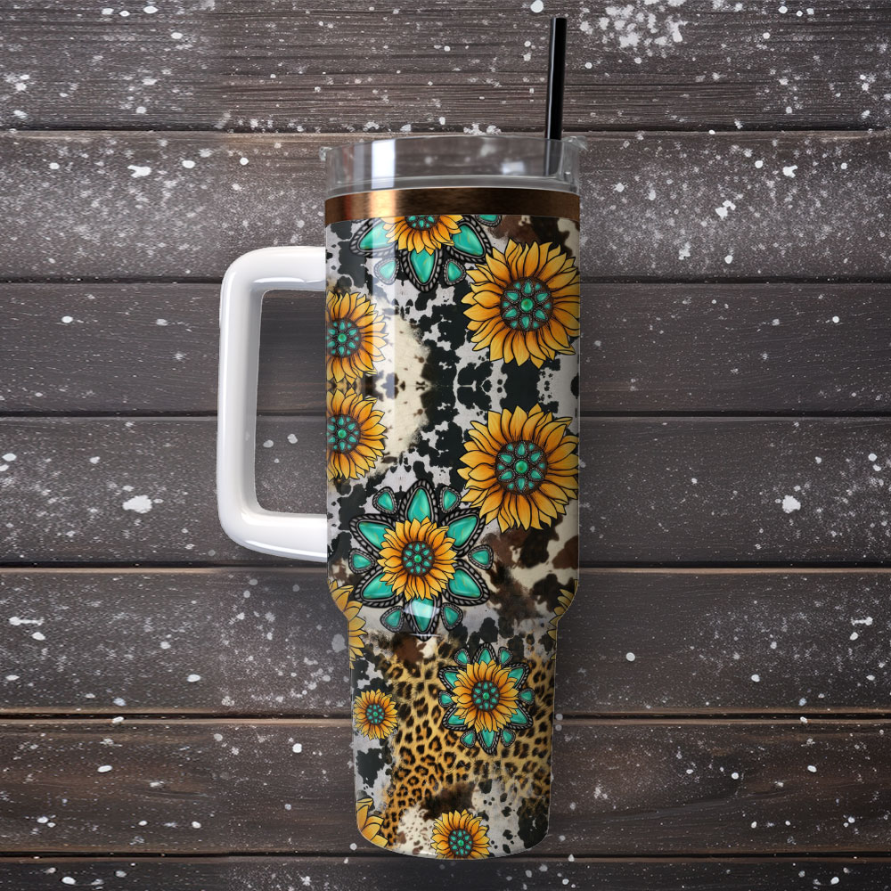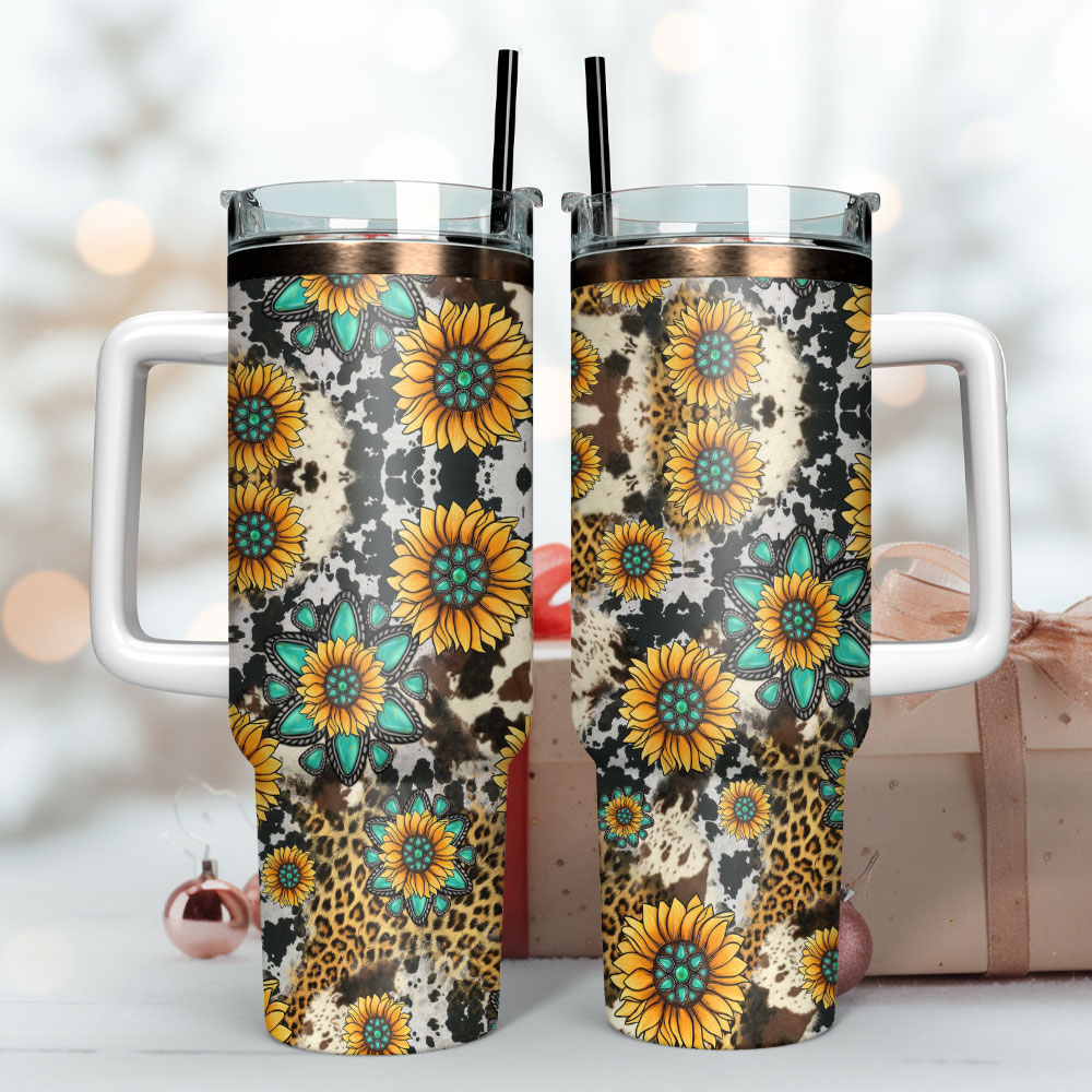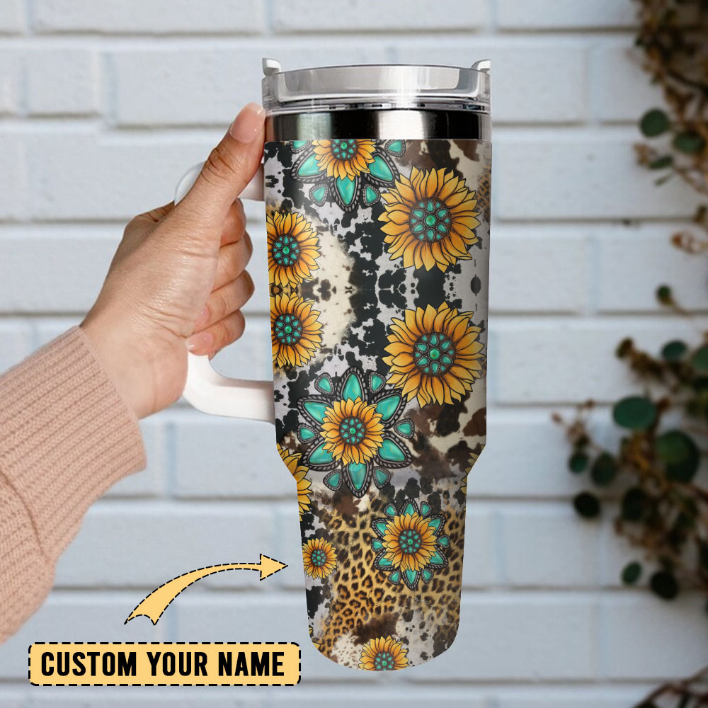 Sunflowers On Animal Prints Artwork Custom Stanley Quencher 40oz Stainless Steel Tumbler With Handle
