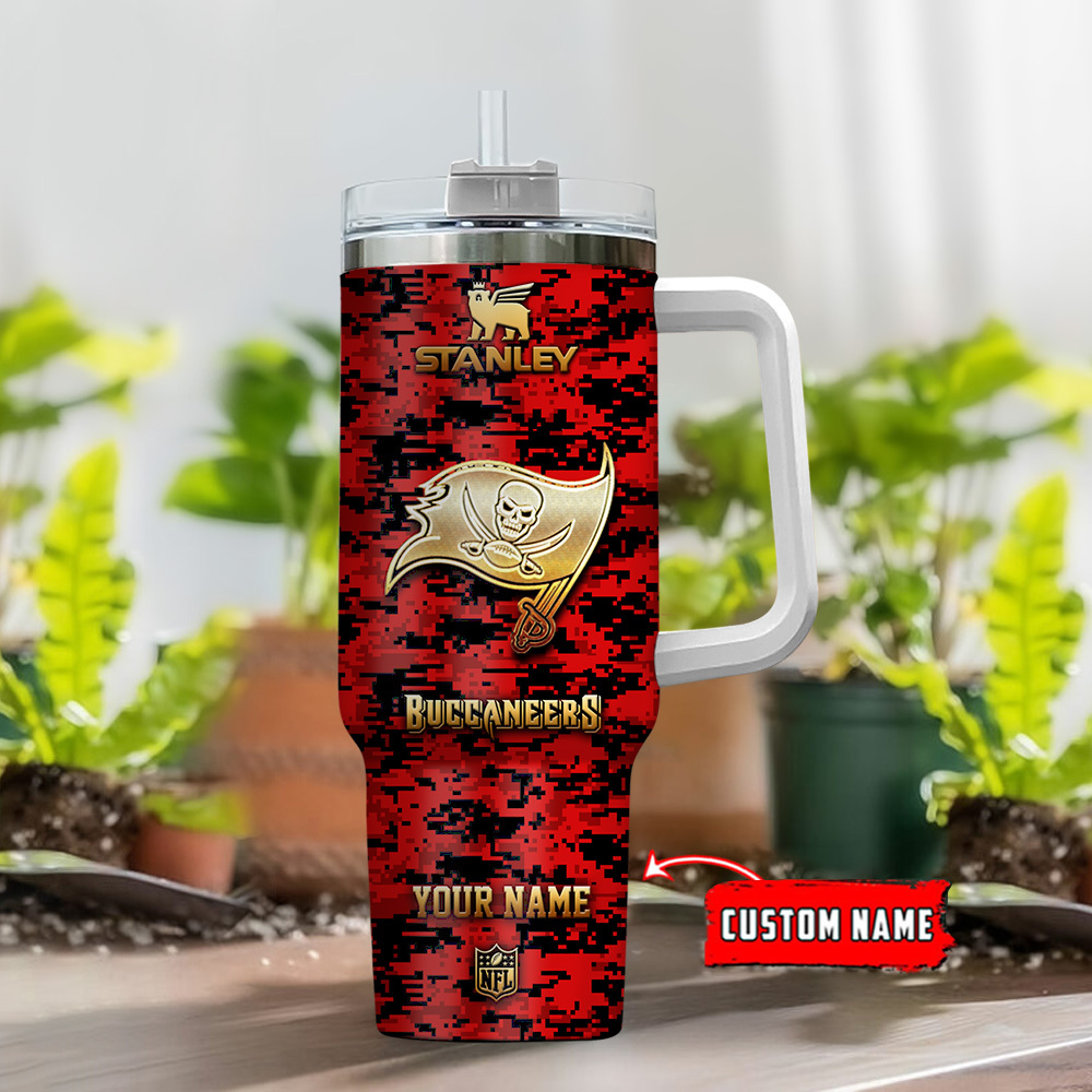 Tampa Bay Buccaneers NFL Camouflage Golden Logo Custom Stanley Quencher 40oz Stainless Steel Tumbler With Handle